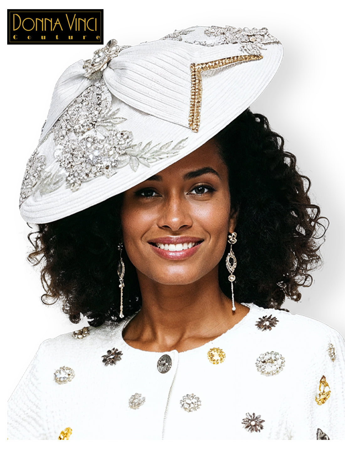 Enchant your audience with the breathtaking artistry of this Donna Vinci Couture hand-made hat. This handcrafted masterpiece is characterized by its expansive wide-brimmed silhouette and a majestic side-swept bow that adds a sense of elite architectural volume. The design features an elaborate floral applique, meticulously encrusted with shimmering crystals and pearls that capture the light from every angle for a radiant finish. To ensure its exquisite form and delicate detailing are preserved, this couture headpiece arrives safely housed in a signature Donna Vinci hard hat box.